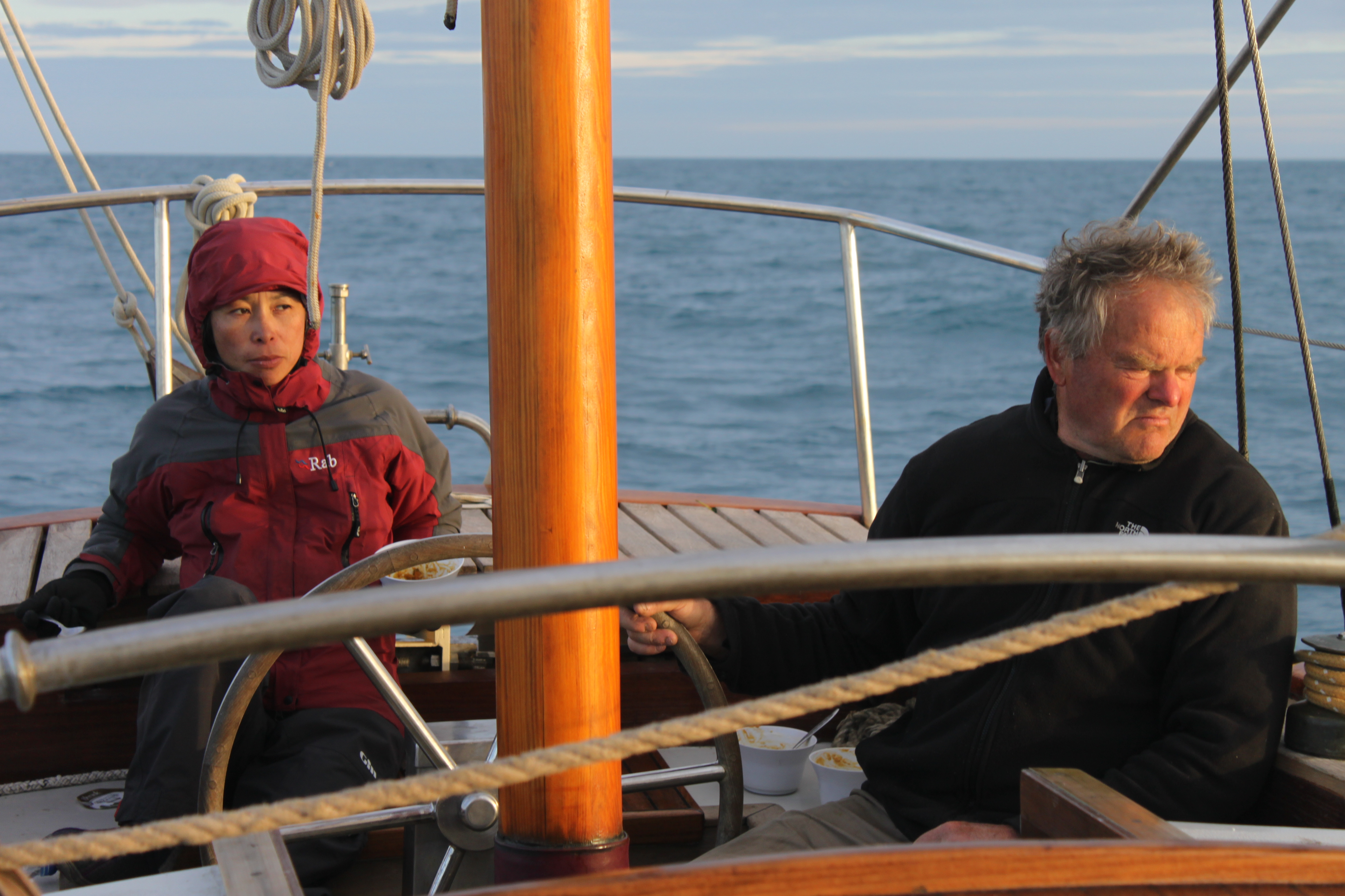 Up (late) at 0100, with a viscous cocoa/coffee mug in hand, as Hue took an extra hour on her watch (probably trying to break her cetacean curse). The breeze has freshened and a light drizzle adds moisture to the spray-drenched deck. The flogging mizzen calls for a reef, as Teddy trucks along at five to six knots, holding our magnetic course of 000-020. On two occasions I’m visited by large dolphin-esque shadows, seen before they’re heard, either Orca or Pilot Whales. I extend Hue’s extra hour to Nick, and tag him in for watch at 0400.