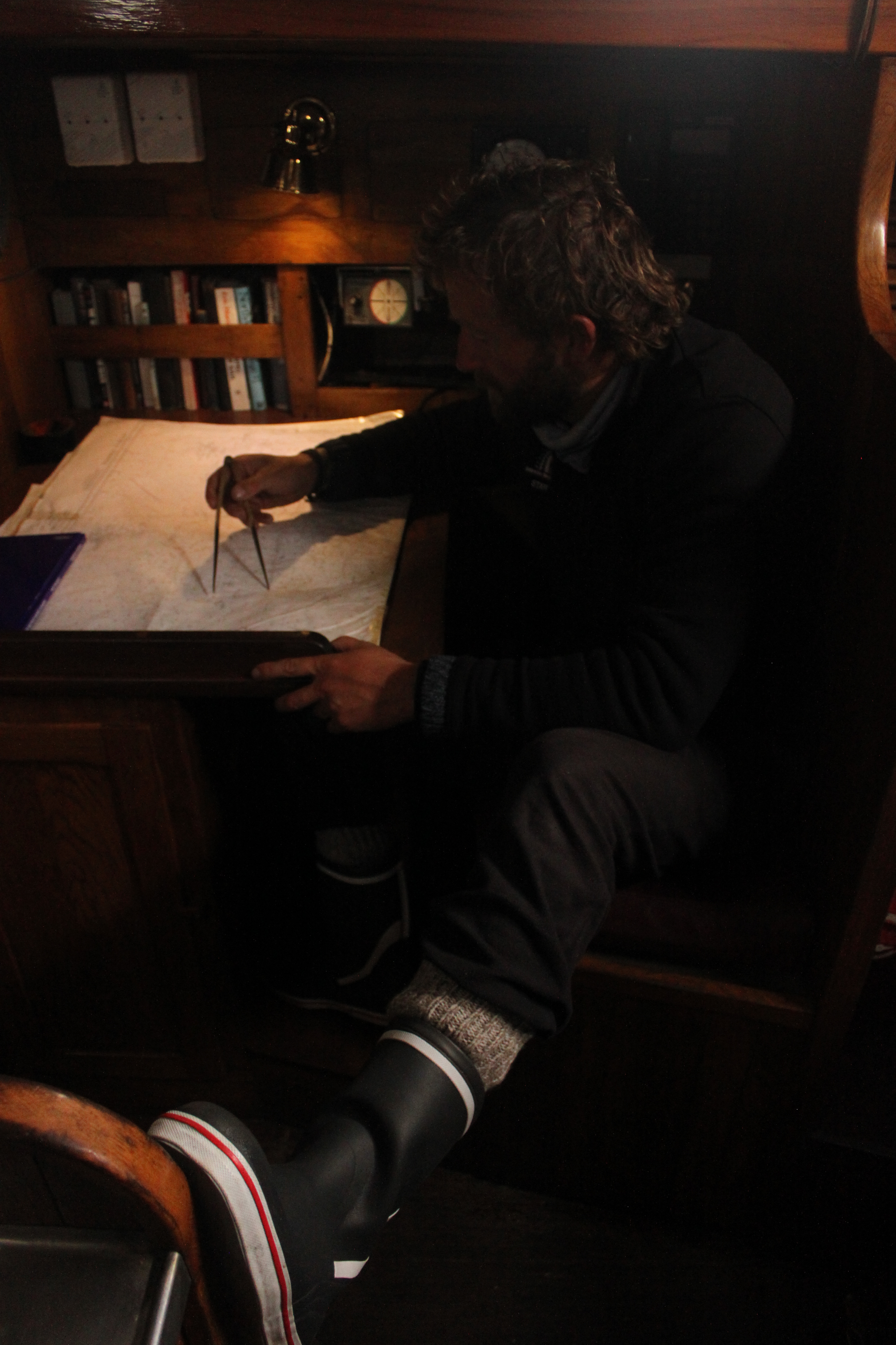 I’m woken by Hue just before my 0000 watch, as a large brightly lit vessel crosses our stern less than a mile off. Without AIS or other modern kit, we’re left to guess as to the nature and purpose of the vessel. Whatever it was, it was big and close enough to spook Hue, and Teddy is now off-course, heading east. The backed mizzen has prevented Hue from getting back on track. Drop, turn, re-hoist. Hue heads to sleep while I settle in to an uneventful two hour watch, tagging out for Nick at 0200.