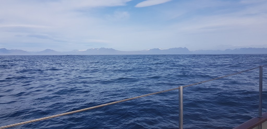 Relieve Nick from watch at 0400, 27th June. Land Ahoy! As I raise the genoa and shake out the main, I can make out the geometric outlines of several peaks on the hazy horizon. A stack of lenticular clouds point to the Vatnajökull, Iceland’s largest icecap, some 7,900 km². The sun is out and the breeze is off our port quarter, downwind we go. By 0700 we’re 17 miles off Papey, the stays’l and mizzen are dropped and the genoa is poled out as we surf across a greasy sea. the raw geology of Iceland looms nearer and nearer, and the air is full of the smell and fell of ice. We’re here.