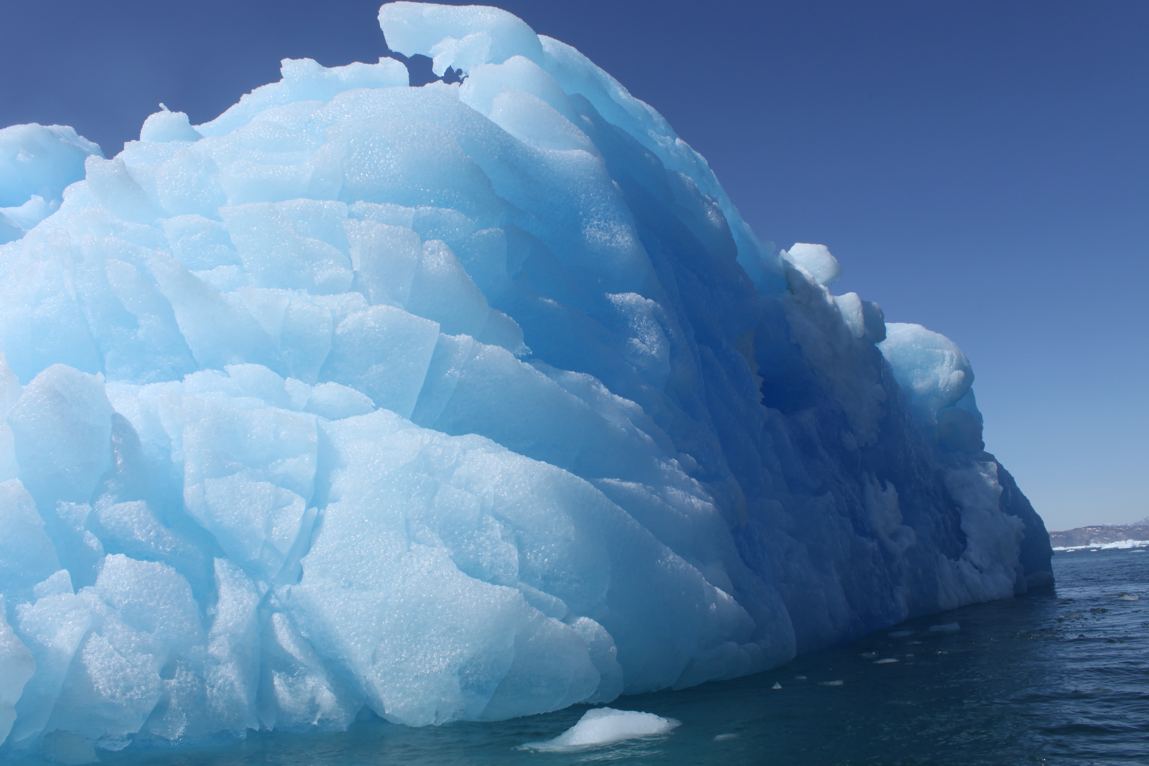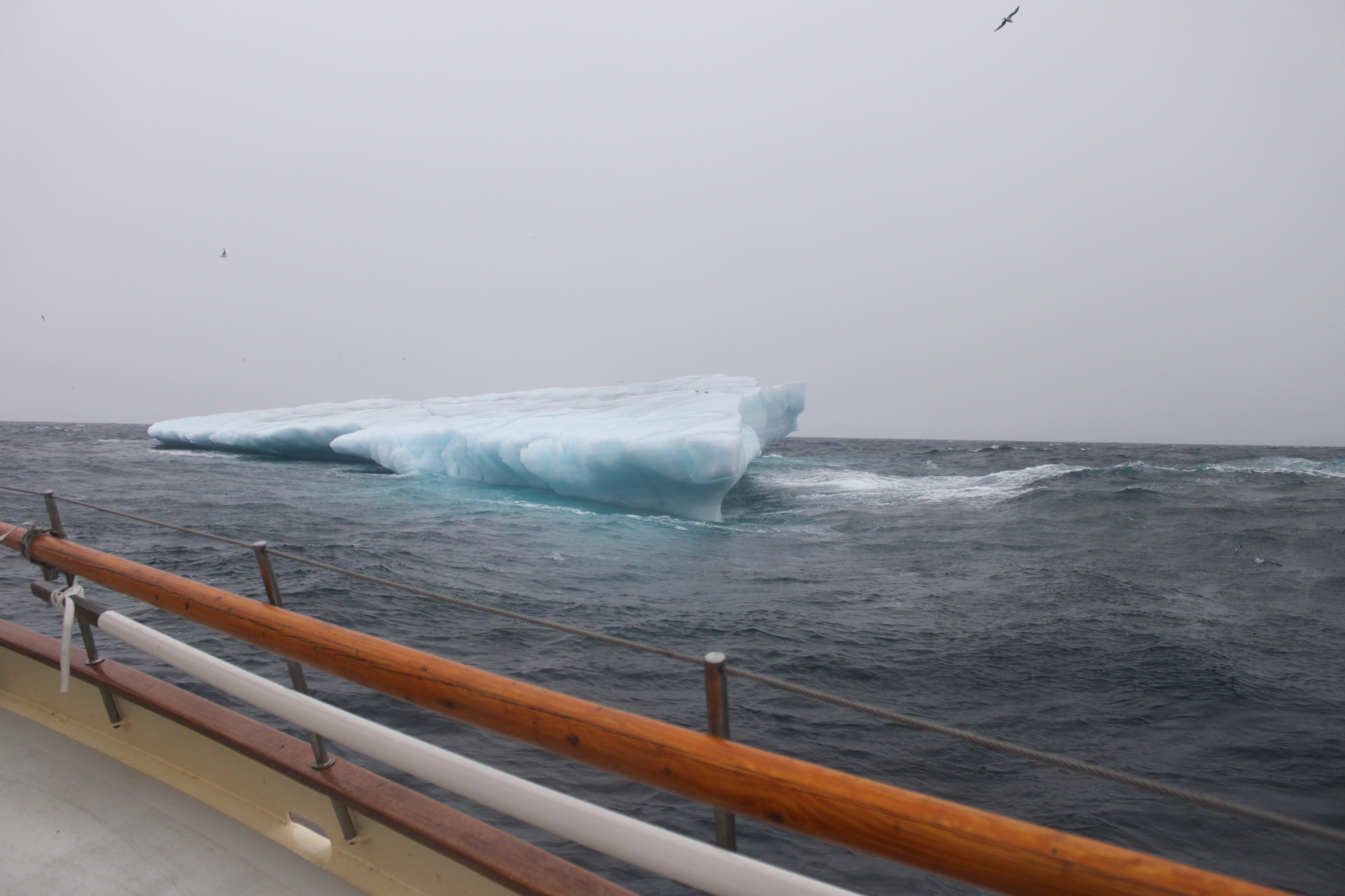With the sea and wind progressively dropping throughout the early morning, we lean into the familiar and comfortable passage-making rhythm. Multiple coffees, pages of good books, conversation both enlightened and inane. All of thus rudely interrupted by a urgent cry “ICEBERG AHEAD!”. No snoozing now; not more than thirty hours out of port and we’re being formally welcomed to the Arctic by a most polite advance guard. A low, flat berg wallows into view on our starboard bow, bobbing languidly in the easing swell, the telltale turquoise highlighting the protruding spurs below the waterline that could turn a polite encounter into a titanic event for a lesser vessel than Teddy. We maintain a respectful distance, best to play it slow in the early stages of this relationship. There’ll be plenty of chances for more intimate contact in the days to come. Icebergs at sea are new to both Darren and Diego, if more familiar to Nick and myself (Greenland and Antarctica respectively), nevertheless the first sighting is exhilarating. Like children (allegedly), the first iceberg always gets a disproportionate amount of attention in comparison to it’s later siblings – oohing, aahing, and innumerable photographs heralding it’s arrival. Complacency tends to set in after the hundredth berg or so, with newcomers really having to work hard to impress the onlookers. It is a testament to the seemingly infinite variations in size, form and colouration of bergs that one is never truly used to, or bored of, the views amongst the floating sculptures. Although small and low-lying, this first berg has it’s own story to tell, flat surfaces oriented non-horizontally showing previous waterlines prior to melt-induced rollovers.