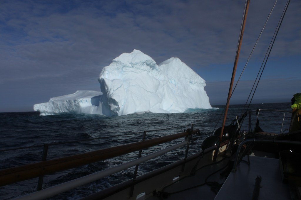 Around 1900 a proper sized berg looms over the horizon, easily dwarfing Teddy’s 49′ main mast by another fifty percent, and glowing with the eerie iridescent blue that seems internal to many larger blocks of ice. The bulk of the berg has further effects. Like any massive body, it exerts a gravitational pull, drawing Teddy and her crew closer and closer. Well within the “splash zone”, we gaze up in awe at this lumbering behemoth, captivated by the implied time and distance traveled by the pristine ice crystals which originated as fallen snow somewhere in the Greenland interior, some time ago. As we leave the berg astern, we are given a gentle reminder as to the realities of the region we are entering. Little more than a hundred yards behind us the berg begins to roll, seesawing through sixty degrees or so for several minutes, sending cattle-sized blocks of ice thudding into the water, most significantly the water most recently occupied by Teddy and ourselves… A timely reminder to beware of beckoning beauty, and perils hidden behind the allure.