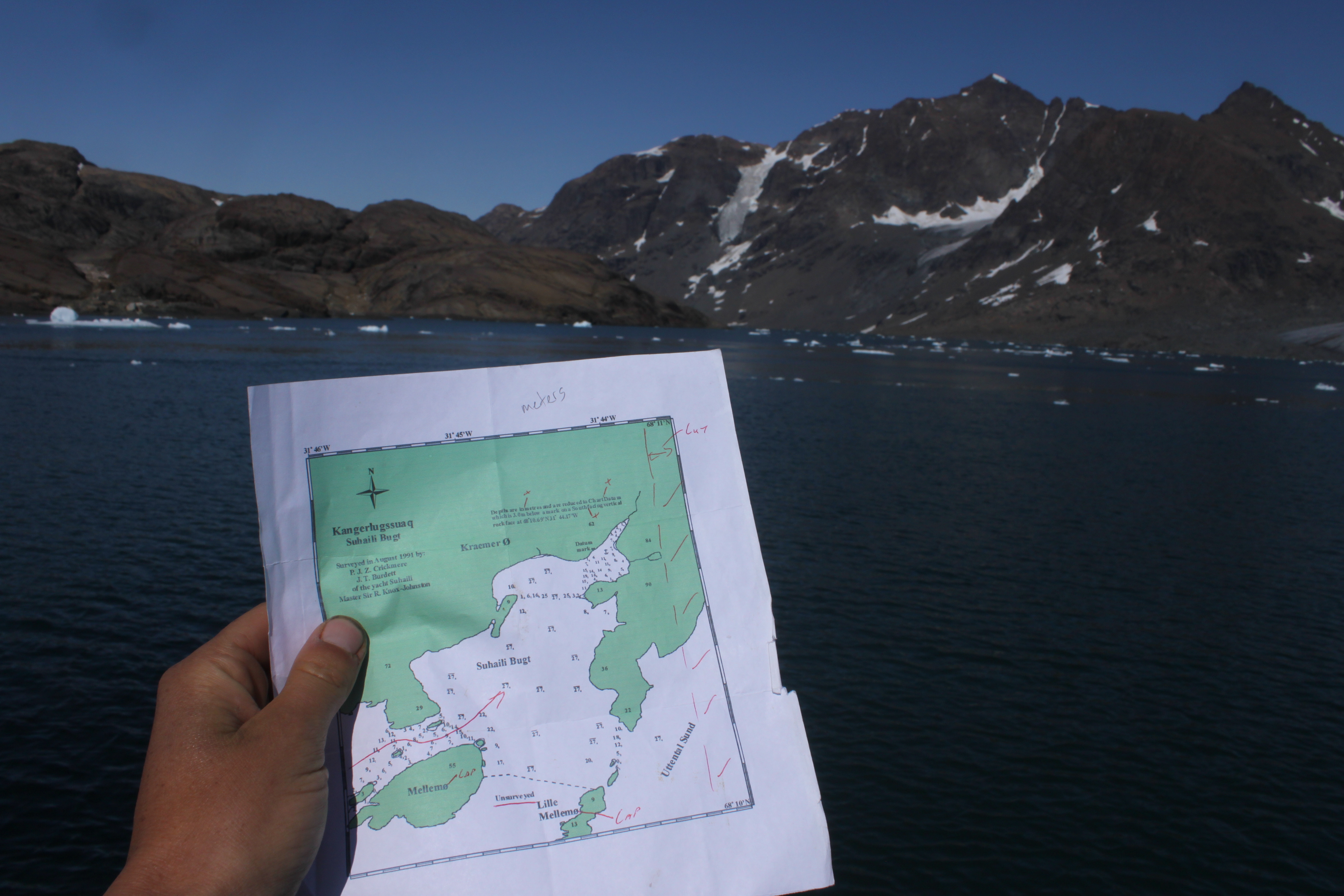 While the official charts may be of little use now we’re within the fjord, we do have some pilotage charts from a rather experienced sailor – Sir Robin Knox Johnston. In the summer of 1991 Sir RKJ and Chris Bonnington mounted a climbing expedition to Kangerlugssuaq Fjord, sailing the infamous Suhaili from the UK to East Greenland to bag a couple of peaks. An account of this expedition can be found here. The anchorage they chose to leave the vessel in, on the southern side of Kraemer Ø, was dubbed “Suhaili Bught”; a hand drawn chart of this, with soundings and a datum mark noted on the rock face, was provided to us by Mike Henderson of Pangey, only one removed from RKJ himself.
